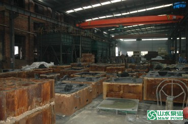鑄造車間建筑面積約5200平方米, 最大起吊重量20噸, 有兩個5噸的沖天 爐,一個2噸的電弧爐,一個0.5噸的高頻爐,二條樹脂砂生產線等設備,可生產包括超低碳不銹鋼在內的各種泵用金屬鑄件,鑄鐵件年生產能力15000噸,鑄鋼 件年生產能力1500噸,采用的樹脂砂造型新工藝,與傳統粘土造型相比,鑄件表面粗糙度降低了兩個等級,鑄件的光潔度、尺寸的精確度都有很大的提高,鑄件內部材質狀況更加良好。
