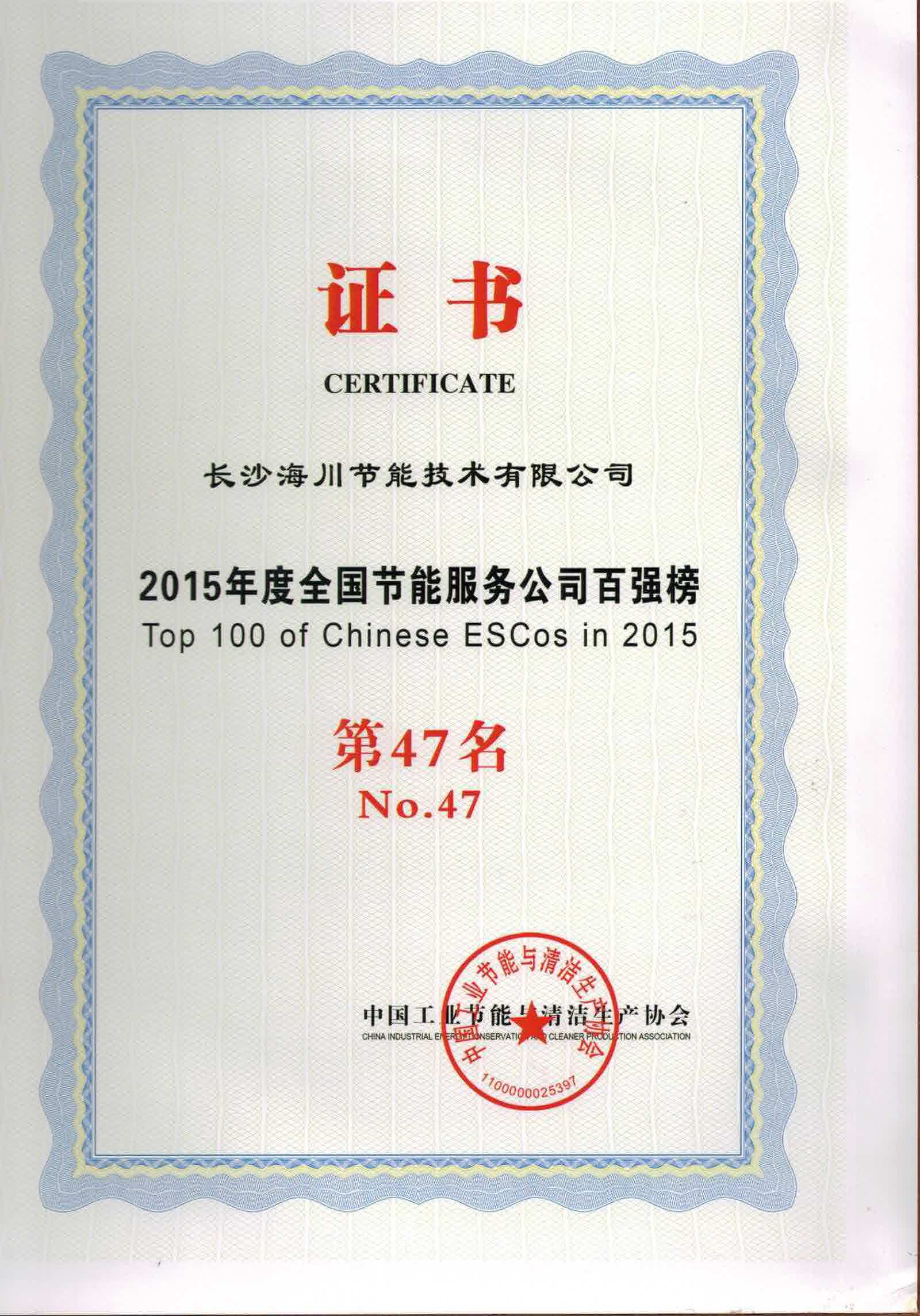 2015年12月,“中國節(jié)能服務產業(yè)發(fā)展論壇暨2015中國節(jié)能服務公司百強榜發(fā)布會”在四川成都舉行,中國工業(yè)節(jié)能與清潔生產協(xié)會發(fā)布了2015年度中國節(jié)能服務公司百強榜榜單及研究報告。山水集團下屬分公司海川節(jié)能以豐富的節(jié)能成果,榮獲2015全國節(jié)能服務百強企業(yè)。