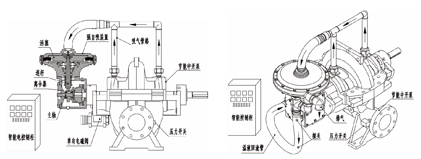 目前,國內(nèi)外使用的中開式雙吸離心泵,工作時需另設真空泵,將泵內(nèi)空氣排盡,或?qū)⒈冒惭b在液面以下,靠水倒灌才能啟泵工作。設置真空泵裝置占用泵房面積,且抽真空會有介質(zhì)積留,特別是泵送有毒有污染不潔凈介質(zhì)時,真空泵裝置就不能使用;而水倒灌啟動需要增加大量土建,兩種形式造價都較高。我公司拳頭產(chǎn)品ZXS強自吸高效節(jié)能中開泵完美的解決了以上問題。