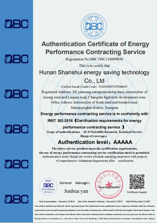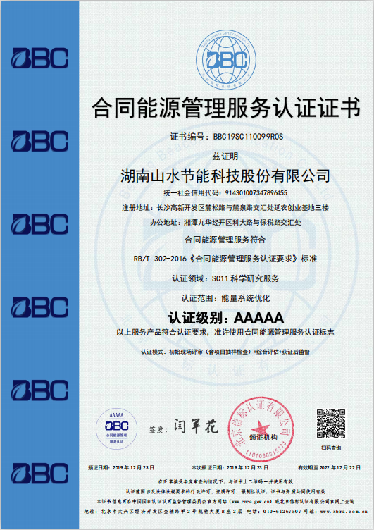 依據(RB/T 302-2016)《合同能源管理服務認證要求》,并通過專業認證機構(認證標準編制單位)資質審查、工廠及項目現場核查,綜合評定后,于2019年12月,湖南山水節能科技股份有限公司在“能量系統優化”服務專業類別榮獲“合同能源管理服務最高等級認證(AAAAA)”。
