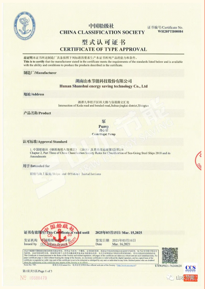 近日,湖南山水節(jié)能科技股份有限公司生產(chǎn)的離心泵系列船用泵獲得中國船級社頒發(fā)的型式認可證書,標志著我司生產(chǎn)的船用離心泵在生產(chǎn)設(shè)計、工藝流程、產(chǎn)品質(zhì)量等方面均達到了國家船舶及海上設(shè)施標準要求。型式認可證書的獲得為我司拓展船舶行業(yè)領(lǐng)域打下堅實的基礎(chǔ),進一步提高企業(yè)知名度,提升市場競爭力。