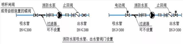 2、消防水泵的出水管,上應設止回閥、明桿閘閥;當采用蝶閥時,應帶有自鎖裝置;當管徑大于DN300時,宜設置電動閥門;