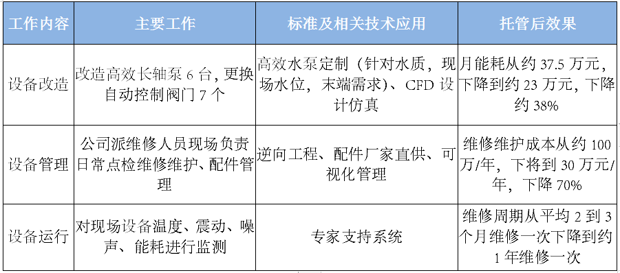 柳鋼熱軋2032線循環水系統旋流井工藝段,有7臺水泵,其中包括5臺抽水長軸泵,2臺沖渣泵,設備年代久遠,故障率頻繁及運行成本高,給用戶帶來了很大的困擾,柳鋼在積極尋求解決方案。我司獲得信息后,結合柳鋼熱軋的實際情況經過實地的調研,出具了托管方案。