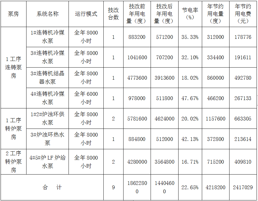 2.1項目目標:按照貴司提供的運行模式,結合本節能技改方案,此節能技改項目平均節電率約為 22.6 %,年節電量約為4218200度,按照電價0.573元/度,預計平均每年可節約電費2417029元。