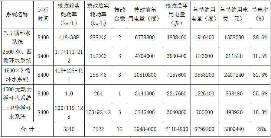 技改效果:通過對南通江山農藥化工股份有限公司循環水系統的現場調研分析,系統目前年耗電量約為2948萬度,預計技改后年耗電量為2118萬度,年節約用電量約829萬度,節電率28 %,按照電價0.7元/度,可實現年節約電費約580萬元。