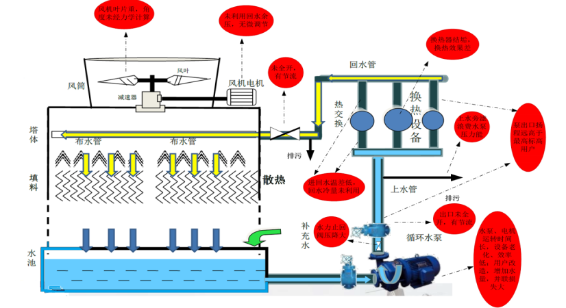 冷卻塔風(fēng)機(jī)系統(tǒng)問(wèn)題:實(shí)行工頻控制,未對(duì)風(fēng)機(jī)系統(tǒng)進(jìn)行有效調(diào)節(jié)。